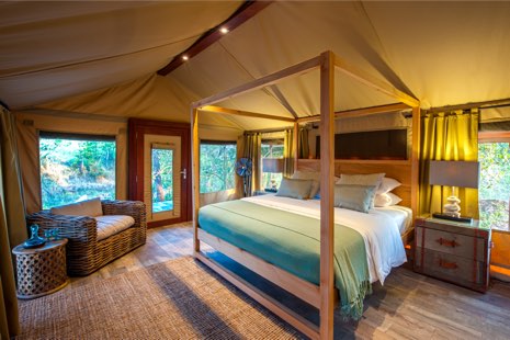 The camp features eight spacious tented suites, each with wooden floors, en-suite bathrooms (hot showers and flush toilets), and wide verandahs overlooking seasonal watercourses. At the heart of the camp is a large mess and lounge tent facing a waterhole – a magnet for wildlife, particularly elephants and buffalo, providing exceptional game viewing from camp itself.